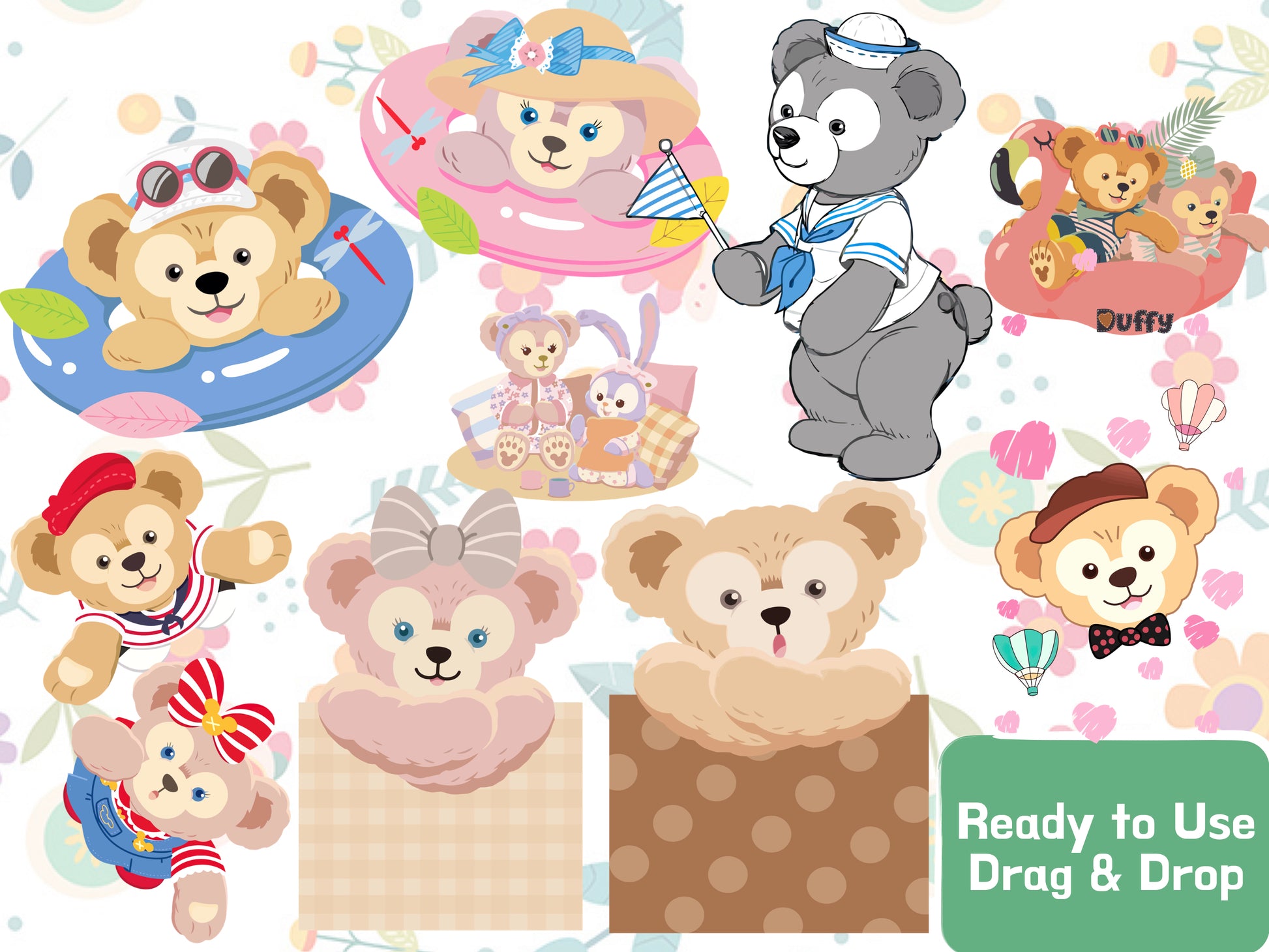 Capture the magic of Disney with our Duffy and ShellieMay digital clip art collection! These adorable characters, beloved for their heartwarming adventures, are now available as high-quality PNG files with transparent backgrounds. This set features Duffy the Disney Bear, ShellieMay, and their charming poses, perfect for a wide range of creative uses such as DIY crafts, birthday invitations, digital scrapbooks, and party decorations.